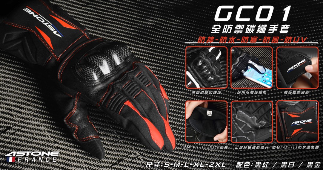 GC01全防禦碳纖手套,超高機能性防摔、防水、防寒、防風、防UV,配有頂級碳纖護具,舒適質感及安全性一次到位,CP值超高的新選擇。