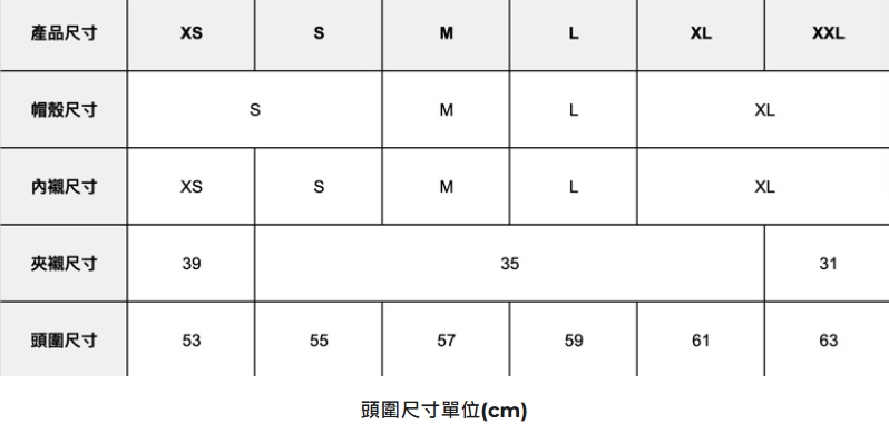 帽殼主體尺寸有 4 種獨立尺寸,分別為S,M,L 和 XL,
