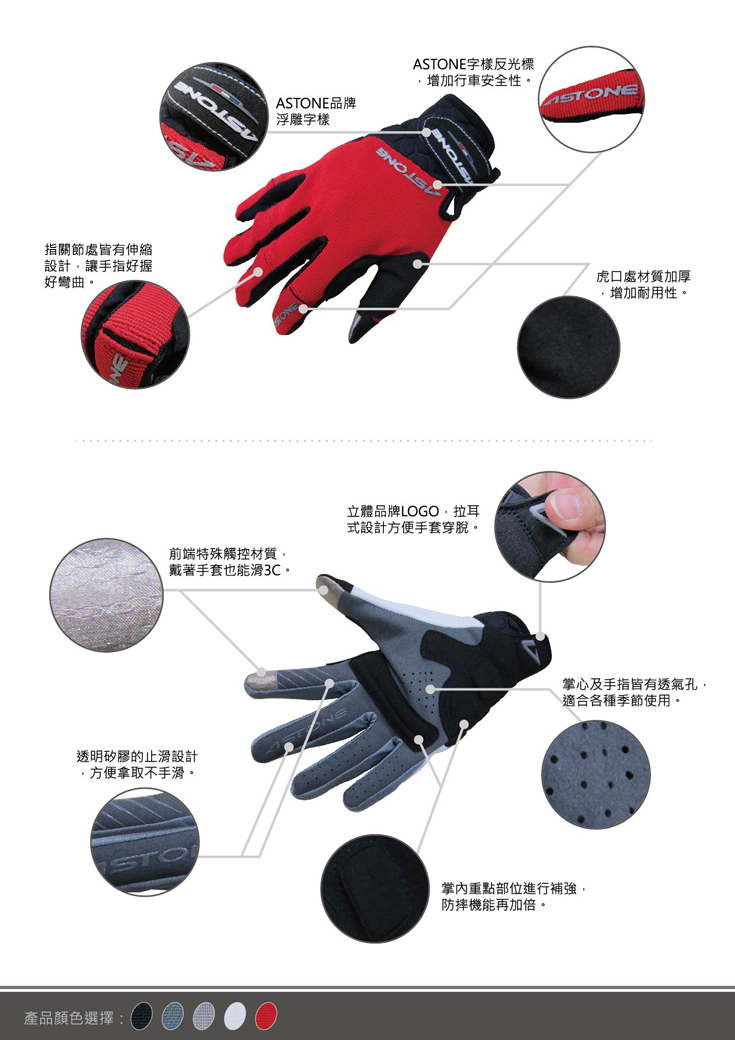 四季觸控手套 共有三款不同顏色,反光設計夜間行車更安全,掌心重點補強,指關節雙重伸縮設計好彎曲。