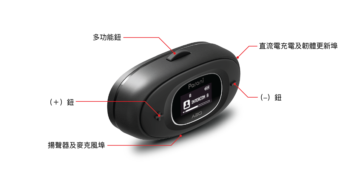 A20提供了優異的對講音訊體驗,提升對講系統低頻及整體30%的清晰度;當二位Parani使用者將耳機與彼此配對後,就能啟動高清晰的雙向對講功能,並獲得最佳的音質。Parani A20支援藍牙對講功能連結最多其它三台Parani耳機用戶,連線距離最遠可達1公里,最長16小時通話時間。主機提供三鈕操控介面及LCD顯示幕,讓使用者能夠快速的以視覺方式得知像是音量、電量之類的耳機狀態。Parani A20提供包含一組硬桿麥克風及一組軟線麥克風讓使用者選用。